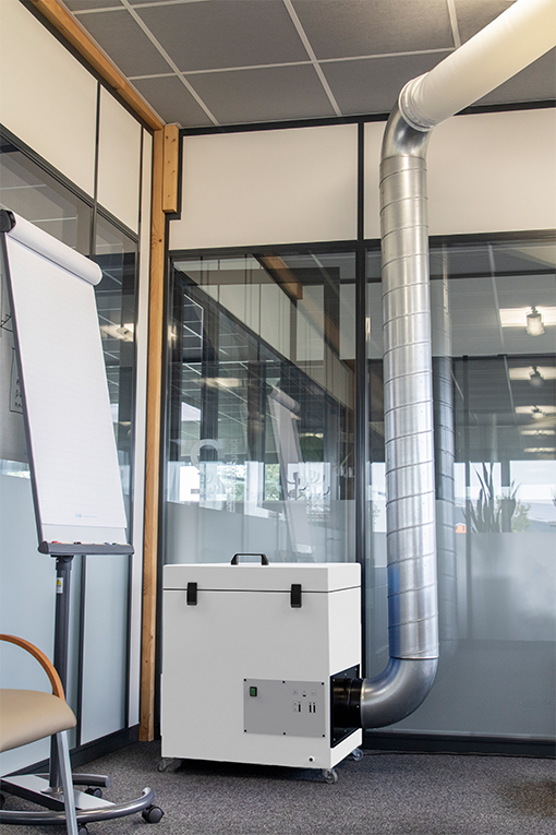 Danach strömt die gereinigte Luft über die Textilfilterschläuche zurück in den Raum. Auf diese Weise befinden sich die Anwesenden in einer Hülle aus sauberer Luft. Ideal für Orte mit größerer Belegung, wie Büro- oder Besprechungsräume.